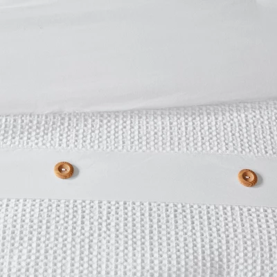 Give your bedroom a simple and clean allure with the Lucina 3pc Cotton Waffle Weave Comforter Set. The 100% cotton comforter and shams feature a waffle weave that provides a soft textured look and feel. Decorative wood button details adorn the face of the comforter and shams for a charming and functional accent. With a fresh contemporary style, this cotton comforter set is machine washable and pairs perfectly with any bedroom décor.