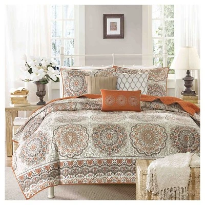 Menara 6pc Reversible Coverlet Set instantly adds color and flair to your bedroom. Its multi-color floral print with large medallions is a modern twist to a classic look. The embroidered detailing on the three decorative pillows pulls the whole look together. This coverlet set also includes two matching standard shams. To complete the bedding set, three decorative pillows with embroidered and pleating details are included. With a microfiber polyester face and a brushed fabric reverse, this coverlet is soft to the touch and machine washable for easy care.