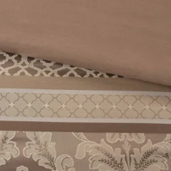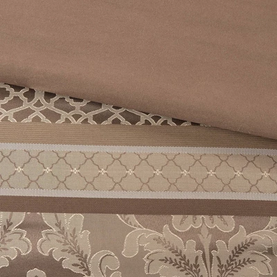To add a touch of richness to your current decor, the Mirage 7pc Jacquard Comforter Set offers a luxurious update to your room. Made from polyester jacquard, the comforter and shams share leaf, striping and ironwork motifs. This collection will adding a lavish feeling to your decor. Three decorative pillows feature pleating and embroidery details that correspond back to the comforter, while a rich bed skirt helps bring the entire look together. Machine washable for easy care, spot clean on decorative pillows, this jacquard comforter set brings an extravagant and traditional touch to your bedroom. An included bed skirt give the comforter set a truly finished look.