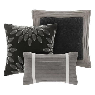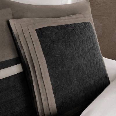 The Dakota 7 Piece Comforter Set offers a classic and refined update to your bedroom decor. This transitional style comforter features a pieced microsuede design in rich contrasting colors to create an incredibly soft look and feel. The 2 matching shams also flaunt a pieced construction to coordinate with the faux suede comforter. A solid bed skirt and 3 decorative pillows with a mix of embroidered designs add the perfect finishing touches to complete this lush traditionally-inspired comforter. Machine washable for easy care, items in the set may come in a rolled or compressed packaging, which will need to be fluffed up or steam ironed before use to remove wrinkles.
