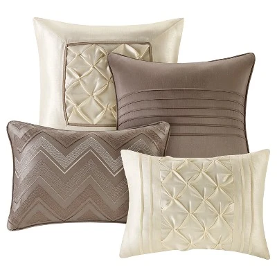 Invigorate your space with the Madison Park Essentials Joella 24 Piece Room in a Bag. The lavish tufted details flaunted on the comforter, shams, and window valances deliver an elegant statement in bold, natural hues. A large border frames the luxurious comforter, adding charm and dimension to the bedding set. Matching shams echo the motif seen on top of the bed, creating an elegant look in your space. An included microfiber sheet set and bed skirt complements the bedding collection and offers exceptional comfort and style. Two Euro shams and four embroidered decorative pillows help to complete the bedding set, giving it a finished look. Accompanying this bedroom set are four window panels with four tie backs to keep curtains drawn open, while two tufted valances provide the finishing touches to your bedroom. This bedding set may come in rolled or compressed packing and will need to be fluffed up. Use a steam iron to help remove wrinkles easier.