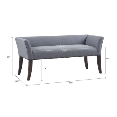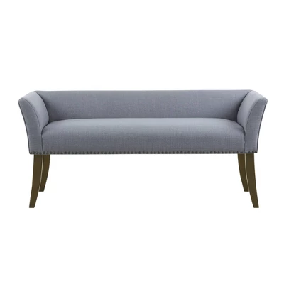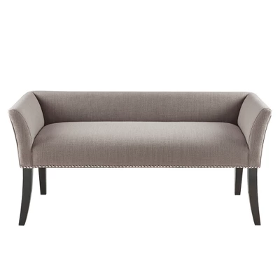 Accent your home with the simple elegance of the Madera Accent Bench. Upholstered in the fabric, this bench features a low back and flared arms that create a sleek and sophisticated look. A nailhead trim adds elegant accent, while the light wood finish complements the upholstery. Perfect for your bedroom or living room, this upholstered bench provides a chic update to your home decor. Assembly required.