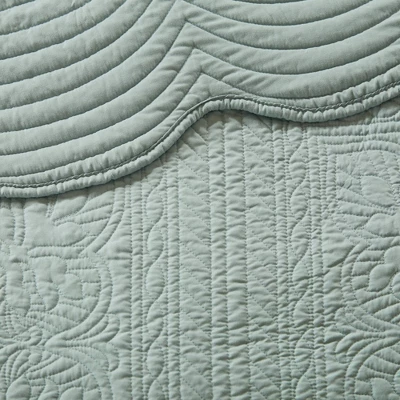 The Genoa 3 Piece Reversible Scalloped Edge Coverlet Set is perfect as a layering piece or as an alternative to your comforter for a charming country look. The coverlet and shams flaunt a classic stitch pattern with scalloped edges that add an elegant touch to your bedroom. This reversible coverlet is filled with cotton filling and features a soft microfiber face, giving your bed a cozy cottage look. This farmhouse-inspired coverlet also has an antimicrobial treatment that provides built-in freshness protection, reducing the growth of odor causing bacteria to keep fabric lasting longer.