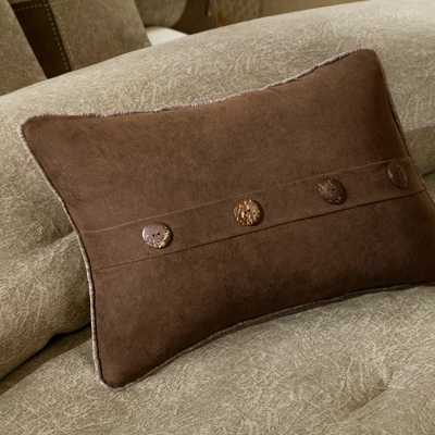 For a warm, lodge look in your space, the Powell Collection is perfect for you. The unique fabric used in this set has a textured earthy print pieced with polyester microsuede at the bottom and buttons for a personal touch. Three decorative pillows using piecing and embroidery of both top of bed fabrics completing this cohesive look. Machine washable for easy care, this comforter set brings a refresh update to your bedroom décor. Items in the set may come in a rolled or compressed packaging, which will need to be fluffed up or steam ironed before use to remove wrinkles.