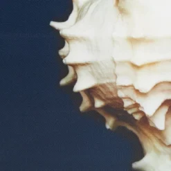 - Coastal seashells designs in natural colors on a dark navy background for a bold, contrasting look