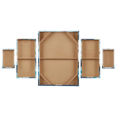 Give your home a beautiful modern touch with the Midnight Tide Blue Gel Coat Canvas 5 Piece Set by Artist Blakely Bering. Showcasing cool blues and earthy tones, this oversized five piece wall art set creates a gorgeous abstract image that can serve as the focal point in any room. The contrasting colors are protected by a gel coating that provides additional texture and a glossy finish, while also preventing fading over time. A cardboard backing on each canvas adds structure and support, while two D-rings on the reverse of each piece makes this set easy to hang. Comes as a 5 Piece set in varying sizes; Display this gel coat canvas set together for an oversized art piece sure to capture anyone’s attention, or hang pieces separately throughout your home to fit any smaller space. Spot clean only.