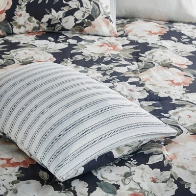 The Sorrel Cotton Printed Reversible Comforter Set includes everything you need to transform your sleeping space into a serene retreat. The comforter is accented with large, expansive florals on a navy background, and it reverses to a striped pattern on a white background for versatile styling. The included pillow shams and decorative pillows feature a mix of solids, prints and embroidery along with ruffled trim or tasseled accents, while the navy bedskirt provides the perfect finishing touch.