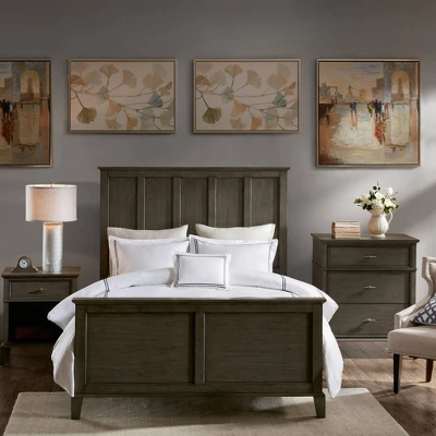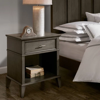 Complete your bedroom decor with the Yardley 1 Drawer Nightstand. This traditional style wooden nightstand features a large single drawer. The open bottom shelf can act as extra storage space or hold a decorative piece. The reclaimed gray wood finish highlights the natural warmth of the acacia veneers and the solid wood. Assembly required.